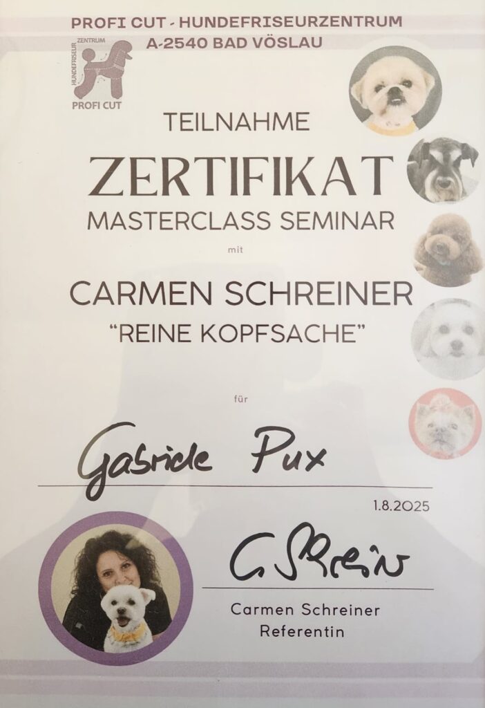 Ich bin ausgebildete Hundefrisörin, Trickdog Trainerin und Züchterin von Tibet-Terriern mit mehr als 20 Jahren Erfahrung als Hundehalterin.